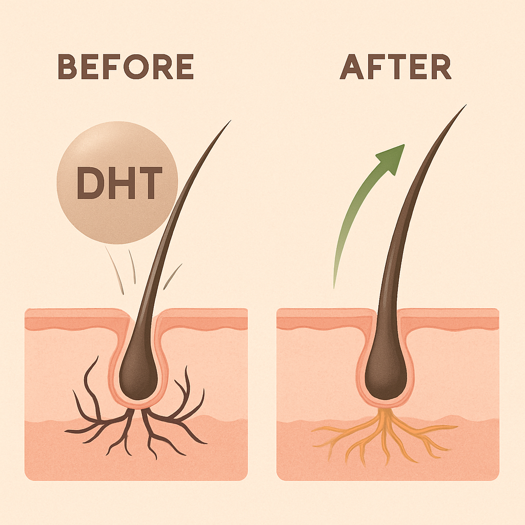 Step 3: Reactivate Dormant Follicles With DHT blocked, follicles that have been "sleeping" can return to their normal growth cycle, producing thicker, stronger hair.